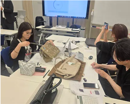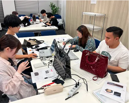 K-ブランドオフでは、直営とFC分け隔てなく定期的に「真贋研修」を行っています。まずはeラーニングでバッグや時計、宝石などの基礎知識を学習。そのうえで集合研修に参加し、実際の商品を使って値付けや査定を体感します。半年ごとのメンテナンス研修や毎月のウェビナーもあり、経験と知識を結びつけながらスキルを磨けるのが特長です。「体感してこそ身につく」——それがK-ブランドオフの研修スタイルです。